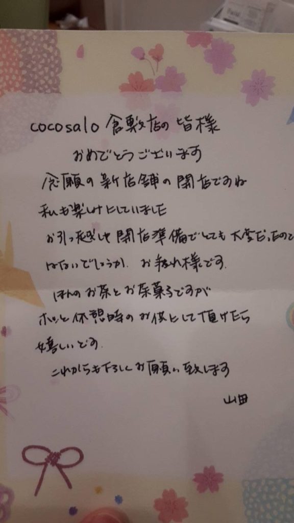 14年思い続けたリニューアルオープンを実現することができて、本当にありがとうございました。ココサロ倉敷店のお客様が、さらに輝かれる人生になられますように、スタッフ全員でサポートさせて頂きます。